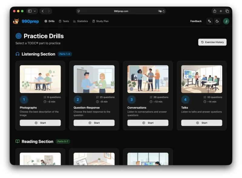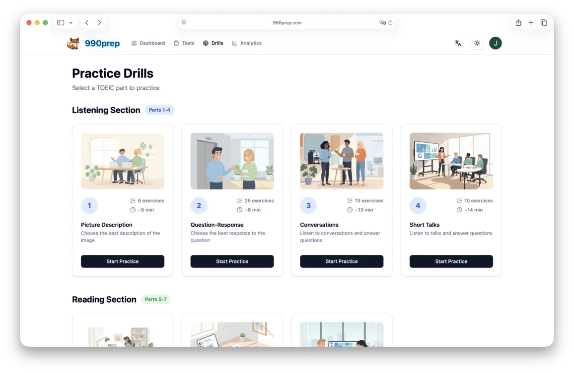 It's better to invest in good tools than to waste your time and retake the TOEIC. Try 990prep free: real exam conditions, instant feedback.